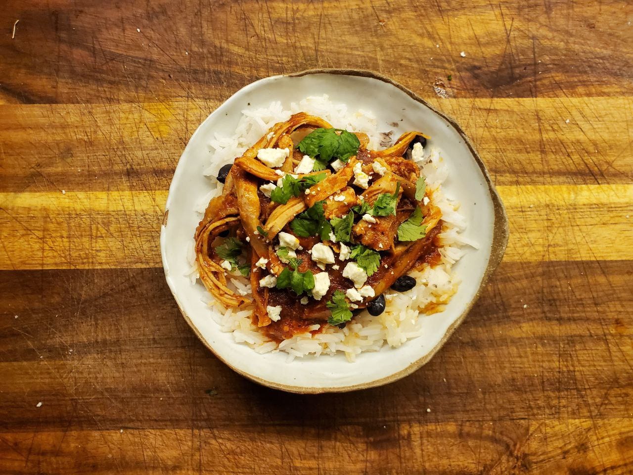 This chicken tinga is a recipe I have known for years, I do not even recall when or where I learned it. I wanted rice and beans, that chicken tinga was made at all was incidental. I simply had all the ingredients for it on hand. I like to reduce the adobo-based sauce until it is very sticky. It is basmati on the bottom with the very same indentation I mentioned earlier, using a tablespoon. This allowed me to fill that “bowl” with black beans, such that putting chicken tinga across the top makes a modest dinner bowl seem positively full to the brim.