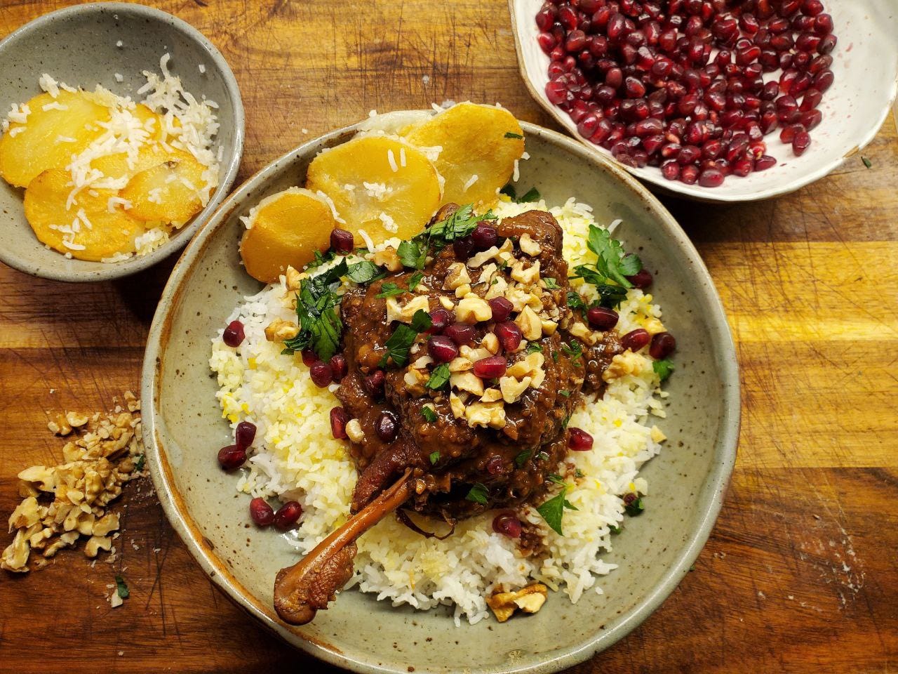 Duck fesenjan is a Persian dish, a stew of chicken legs in a broth that contains both pomegranate molasses as well as walnuts. I’ve tasted few things like it, a truly remarkable profile born from the earthly stock that would have only come from Persia. What better way to highlight such features than to include them in that very garnish! Toasted and roughly chopped walnuts with pomegranate arils, both easy tasks to fit in the long cook-time for both duck fesenjan and the steamed rice and tahdig.
