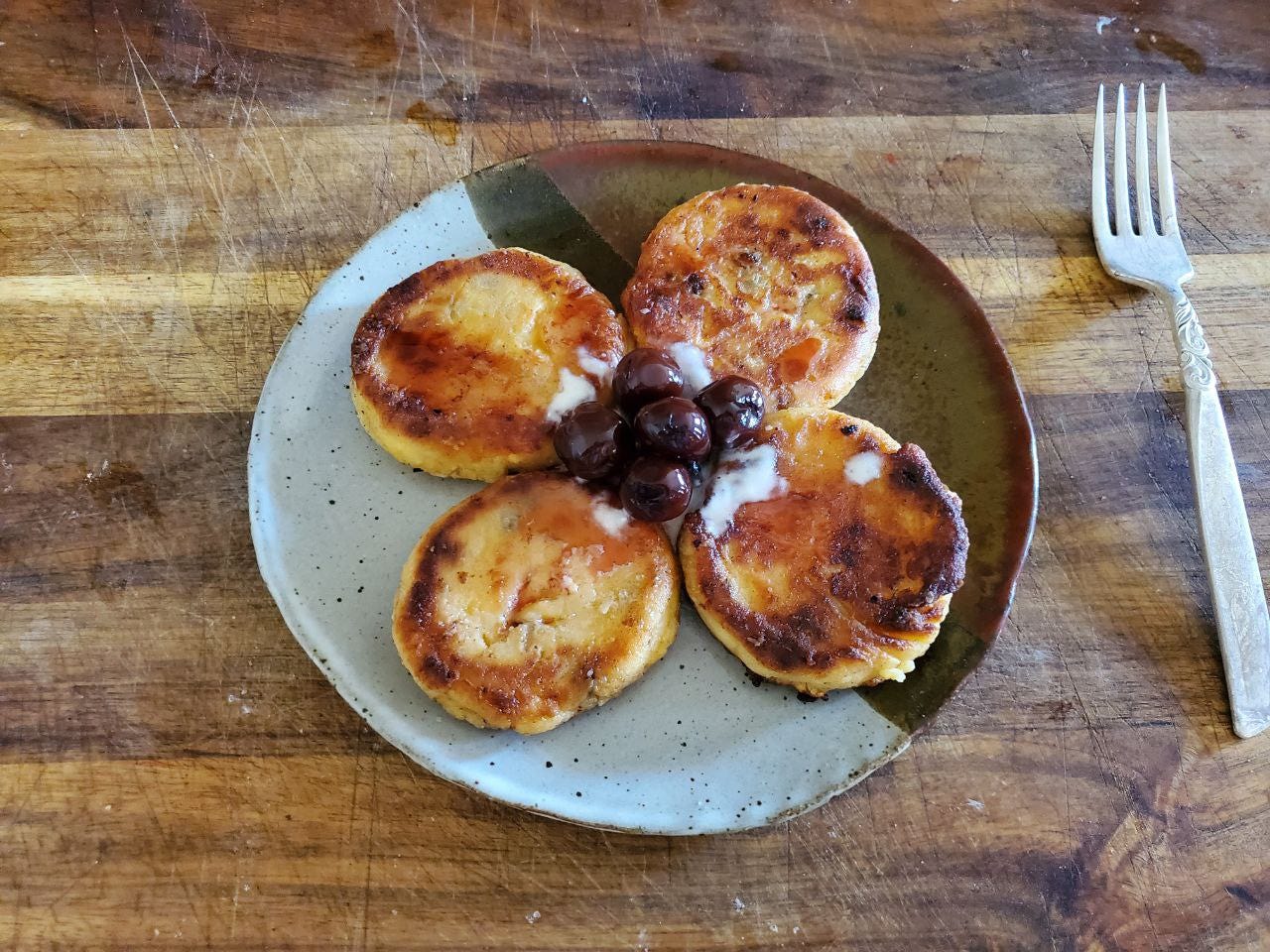 Azerbaijan as a country borders Eastern Europe and Western Asia, because of this there is a unique culinary confluence of traditions. Of Eastern Europe I know sparingly little and of Western Asia I know less, but I wanted to make her in particular an Eastern European pan fried cheesecake known as Syrniki. It took practicing, as it involves an ingredient which is somewhat rare to the United States: farmer’s cheese. Once its rarity is adjusted for, then you have to adjust for the moisture content as no two cheese manufacturers produce the same cheese. It took studying, adjusting ratios, nailing down the gramage of what “half of a large egg white” means in workable, repeatable terms.