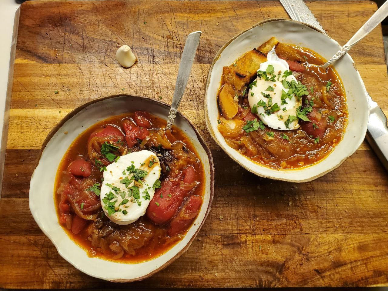 This caramelized onion soup had a Spanish flavor profile with tomatoes and pimenton, all placed atop croutons. Were I to just add parsley and perhaps a bit of olive oil, the finish would have still been drab. The soup was made with caramelized onions and tomatoes, much too thick for olive oil to show any kind of helpful contrast against the rest of the dish. In instances like this, a poached egg is not only the perfect garnish, but the perfect addition which makes the whole dish work. The pillow-y soft whites provide a nice color and textural contrast, and the golden yolk spilling out is likewise sharp and provocative. Without this very garnish, it would simply be a side dish of no remarkable character at all.