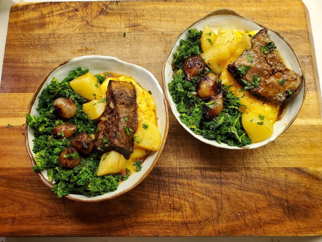 Something I would like to stress before continuing is that there is no rule against putting beef on top of kale. In fact, you could remove the polenta from the equation altogether and the dish would still be fantastic, arrangement would just change. In the above bowls, every element must be visible; this is the real rule which should not change. Were you to instead use a plate proper, the very bottom would be a bed of the same kale, place your short rib portions in the center, reserving your pearl onions to lay around your beefy centerpiece. I made the decision that I made, putting what, where, because after the rules and guidelines, it is once again about taste.